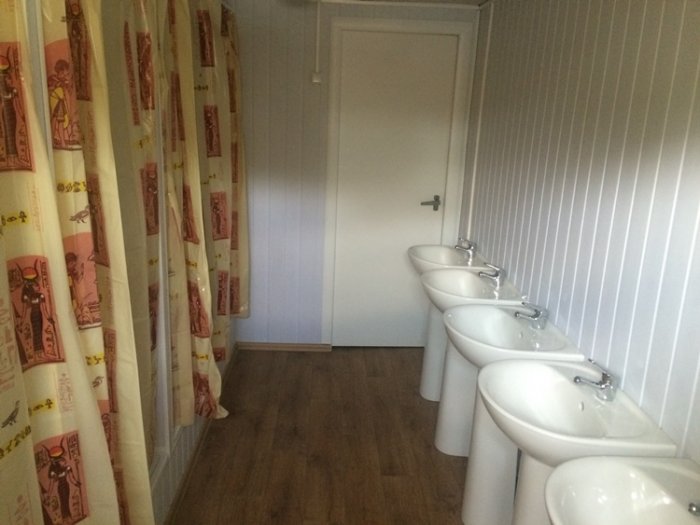 - Душ-бытовка 5 метров для строителей. Душ-бытовка размером 5×2,4 метра (площадь ≈12 м²) — увеличенная модель для средних и крупных строительных объектов с численностью работников 15-25 человек. Отличается наличием двух душевых кабин, двух унитазов, увеличенной раздевалкой.